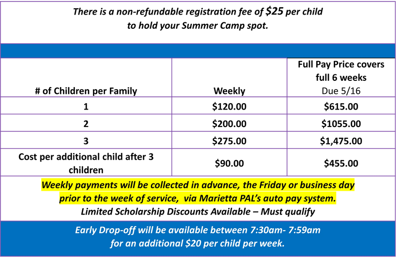 Marietta PAL is offering Summer Camp for youth in rising 1st through 12th grades.